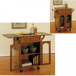 The Noble Oak Kitchen Cart provides you with the freedom to prepare food and refreshments anywhere you'd like. A flip-open top provides extra preparation or serving space, while the lower dual-glass cabinet provides plenty of storage space for any and all utensils and supplies. A pull-out silver tray and dual-side towel racks pair with a noble oak finish to complete the appeal of the Noble Oak Kitchen Cart. Features: Kitchen Cart features solid rubberwood and plywood constructionKitchen Cart has a noble oak finishKitchen Cart features a 2-glass door cabinet with single adjustable shelfPull-out silver trayDual-side towel racksIndustrial quality wheel casters for easy mobilitySome assembly required Specifications: Closed dimensions: 36.75" H x 33" W x 20" DOpen dimensions: 35.75" H x 47.88" W x 20" DWeight: 97 lb