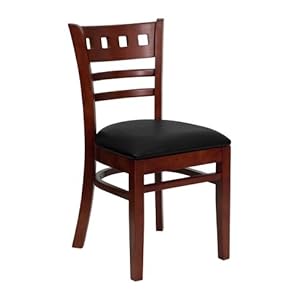 American back style2 in. thick padded seatBlack vinyl fabric upholsteryTwo curved support barsFoot rest rungPlastic floor glidesMortise and Tenon style constructionMetal wood screw reinforcementsWarranty: 2 year limitedMade from solid European beech hardwoodMahogany wood frame finishMinimal assembly requiredBack: 14.75 in. W x 15 in. HSeat: 16.75 in. W x 16.75 in. DSeat Height: 19.5 in.Overall: 20 in. W x 17.5 in. D x 33.75 in. H (37 lbs.)